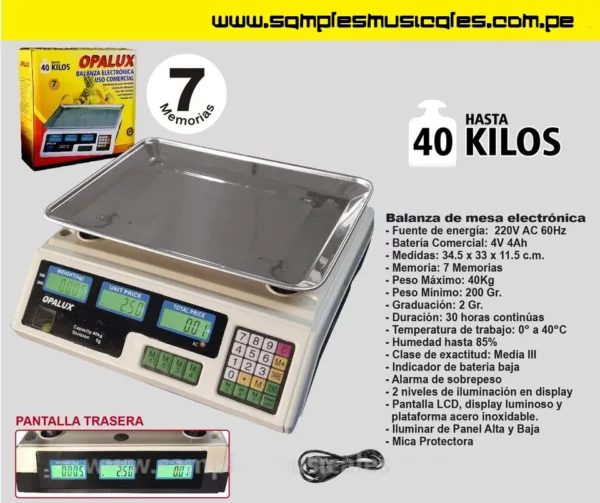 Balanza electrónica digital de mesa 40Kgs LCD recargable con batería 4v4Ah 220v Opalux OP208C