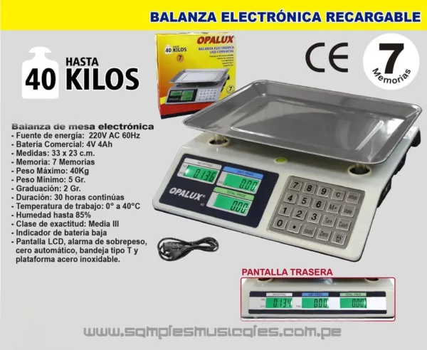 Balanza electrónica digital de mesa 40Kgs LCD recargable teclado metálico con batería 4v4Ah 220v Opalux op982s