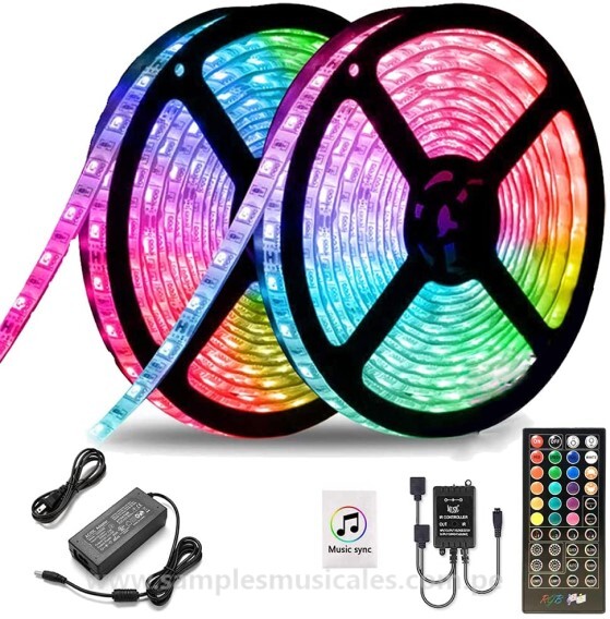 - Lista de embalaje: 2 cuerdas x tiras de luz LED de 5 m, 1 controlador de música, 1 mando a distancia de 40 teclas, 1 transformador de 12 voltios con certificación UL