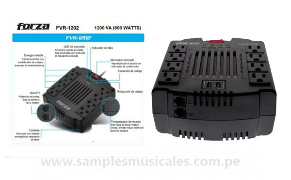 ESTABILIZADOR DE CORRIENTE HIBRIDO 220V.8 SALIDAS 2 USB CARGA FORZA FVR1202USB