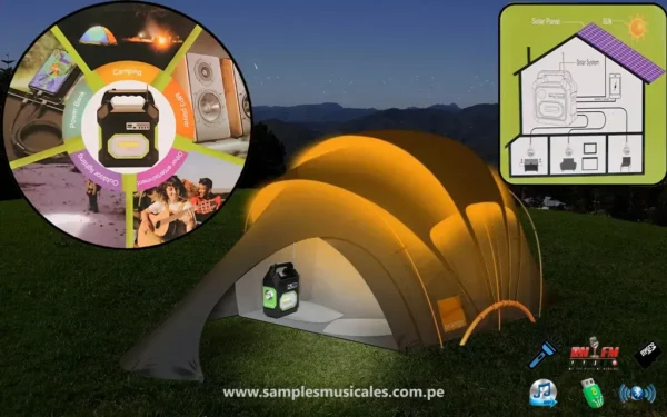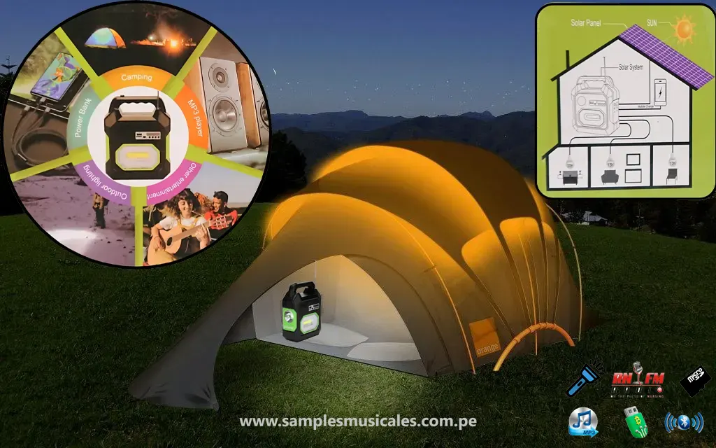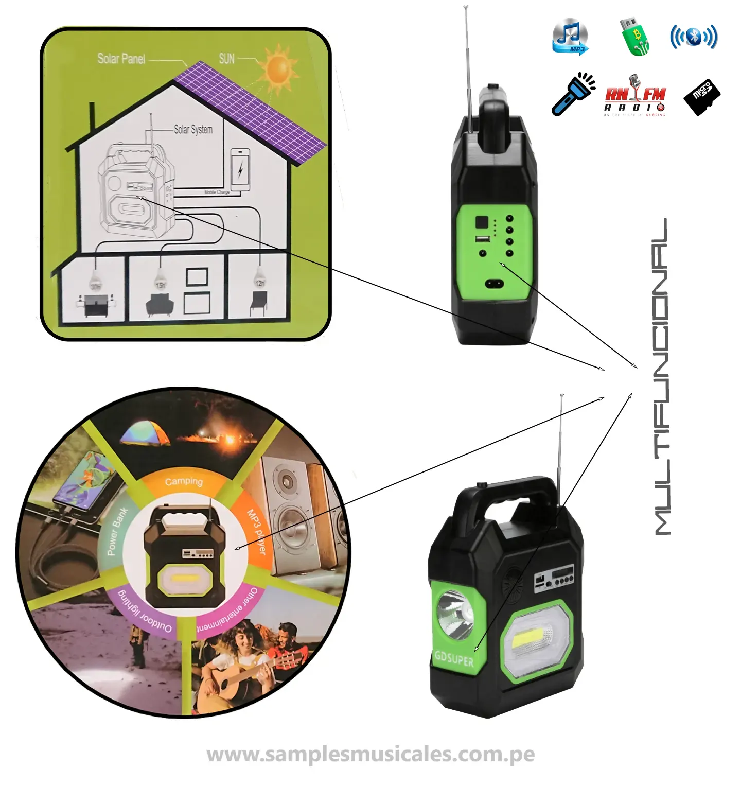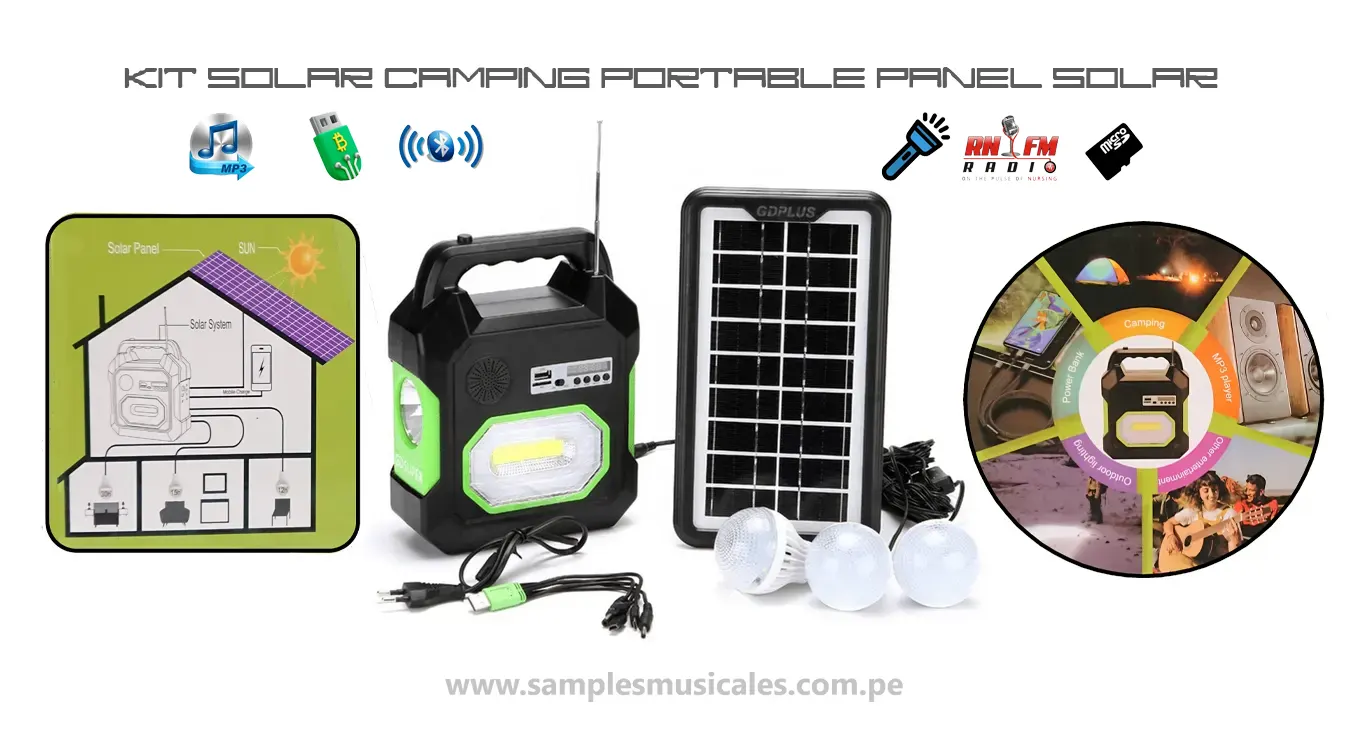 KIT Sistema SOLAR CAMPING PORTATIL PANEL SOLAR Y 220V 3 FOCOS 6V 3 TIPOS DE LINTERNA CABLE PULPO PARA CARGAS DE CELULARES USB SD BLUETOOTH FM SAMPLES GD15