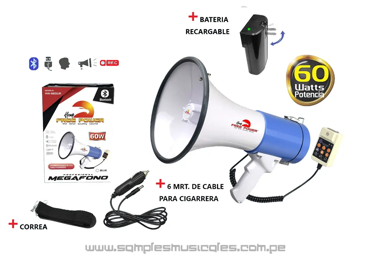 MEGAFONO 60W USB SD AUXILIAR BLUETOOTH BATERIA RECARGABLE 220V Y 12V GRABADOR + 6 METROS DE CABLE PARA LA CIGARRERA + CORREA + SIRENA + ALARMA 1 BATERIA RECARGABLE FREE POWER HW66SURBL