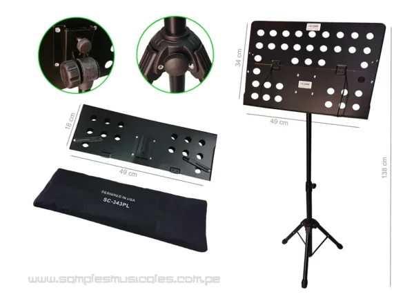 El SC343PL cuenta con un escritorio plegable perforada, hecho de metal altamente resistente. El pupitre viene con retenedores de páginas y pasadores de bloqueo laterales, lo que garantiza que cualquier partitura se mantenga firmemente en su sitio.  es una gran ventaja para los músicos que viajan. Un rodillo de ángulo permite al usuario ajustar el escritorio al ángulo más adecuado. El escritorio se mantiene en este ángulo mediante una goma de fricción. La base de este atril puede alojar dos soportes de tipo clavija para instrumentos (no incluidos)