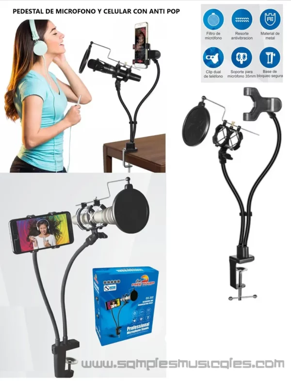 PORTA MICRÓFONO CON ANTI POP Y PORTA CELULAR DE MESA GIRABLE 360º