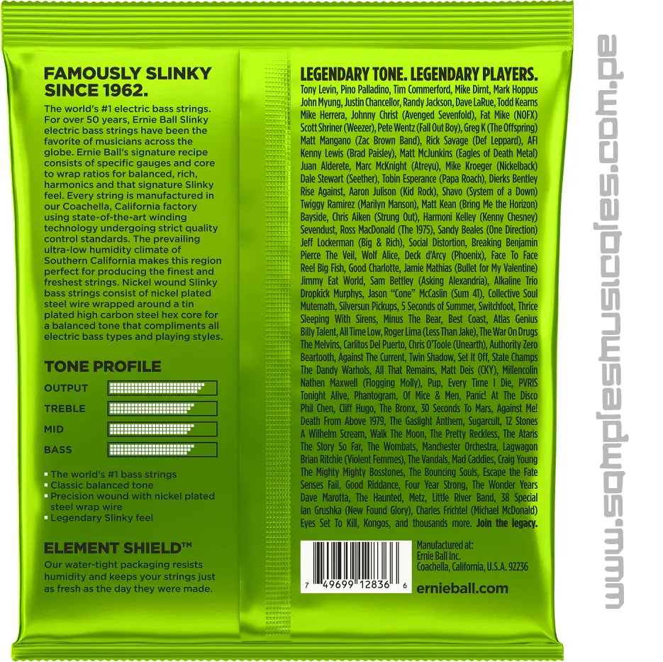 son entorchadas para un sonido brillante y equilibrado. Cada cuerda de bajo es fabricada con la materia prima más fina y fresca en el hermoso valle de Coachella al sur de California. La lista de los músicos que respaldan las cuerdas de bajo Ernie Ball Slinky es muy extensa.
