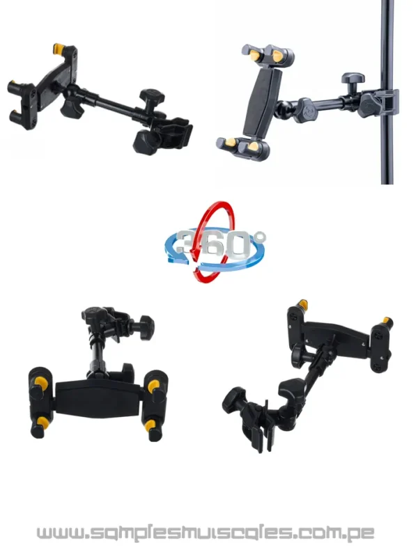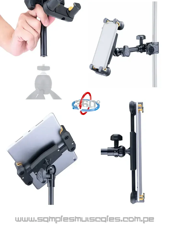 Hoy en día, básicamente todo el mundo utiliza un dispositivo como una tableta o un teléfono inteligente, por lo que Hercules también incluye en su oferta una herramienta para músicos: un soporte para tableta/teléfono inteligente. Súper ligero y al mismo tiempo duradero, fácil de instalar, adecuado para montar no solo en un trípode, sino que también se puede fijar a un escritorio/encimera y a un tubo de trípode, tanto vertical como horizontal, y atornillar en un tubo de 1/4 hilo. Los mangos están diseñados de tal forma que el mango se sujete de forma segura en cada una de sus aplicaciones.