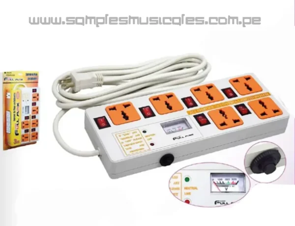 6 tomas múltiples de 10A, 220V, 2200W • Incluye varistor regulador de picos de tensión de corriente, con el cual se reduce el riesgo eléctrico. • Interruptores de activación independiente, con neón, para indicar el inicio y final de una actividad. • Cable de extensión de 3 mt. de largo, vulcanizado flexible, para comodidad de su uso. • Las tomas múltiples permiten el uso común y la compatibilidad con sistemas americanos, europeos y asiáticos. Enchufes con fabricación especial, siendo estas no inflamables y resistentes al calor, generador por el paso de corriente. • Cuenta además con un punto reseteador para activar después de un corte por modificaciones de tensión o picos de corriente. • Voltímetro de rango de 0-300 V AC