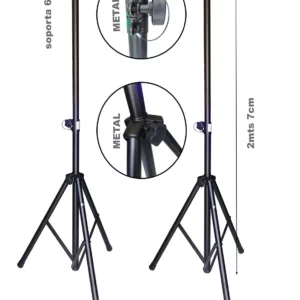 Este pedestal TRIPODE se puede girar para lograr direccionar el sonido, cuenta con un tubo de acero color negro de 0.8 mm de espesor y diámetro de 36 mm lo que le brinda la firmeza necesaria, tiene un perno de seguridad para fijar la altura del mástil en 6 posiciones y una perilla para fijar la apertura de las patas y estabilizar el soporte.